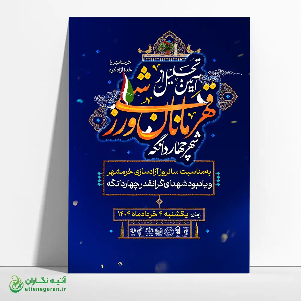 این پوستر، که به مناسبت سالروز آزادسازی خرمشهر و یادبود شهدای گرانقدر چهار دانگه و همزمان با تجلیل از قهرمانان ورزشی این خطه طراحی شده است، فراتر از یک اطلاعرسانی ساده است. این یک ادای احترام بصری به روحیه مقاومت، اراده پولادین و پیروزی است که هم در جبهههای جنگ و هم در میدانهای ورزشی تجلی یافته است. ما در آتیه نگاران با تلفیق هنر، تاریخ و هویت ملی، شاهکاری خلق کردهایم که شایسته تجلیل از این بزرگواران است.